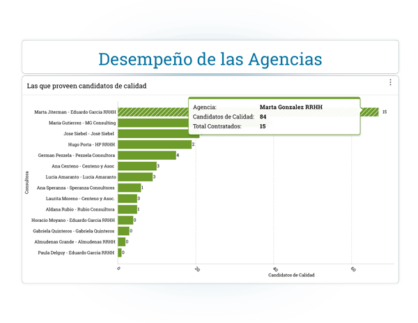 Reportes únicos de evaluación comparativa del desempeño de las agencias, por vacante y área funcional: cuáles presentan más candidatos de calidad, a qué velocidad. Eliges mejor y tu tasa de éxito aumenta significativamente.