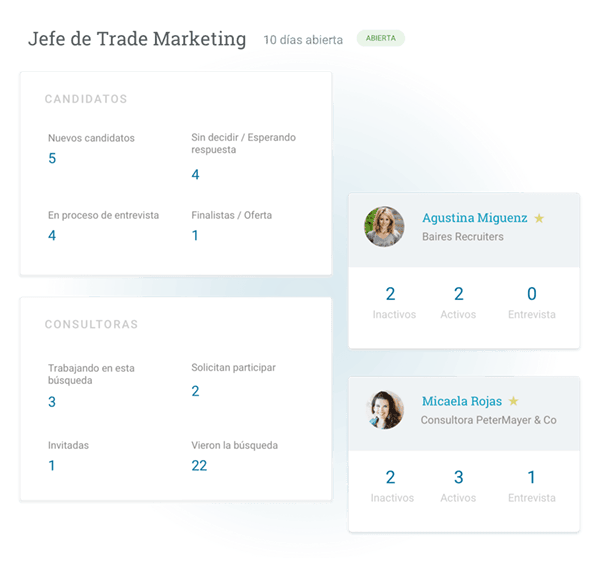 Recibe CVs, define el estado de cada candidato, comunícate con agencias y controla todo el proceso desde un solo lugar. Herramientas de IA y notificaciones automáticas hacen más ágil tu gestión.